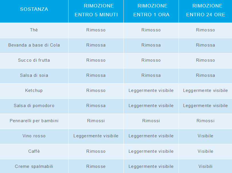 Per eliminare le macchie in modo efficace è necessario rispettare i tempi sotto indicati, utilizzando spugne morbide e acqua miscelata con un detergente neutro.